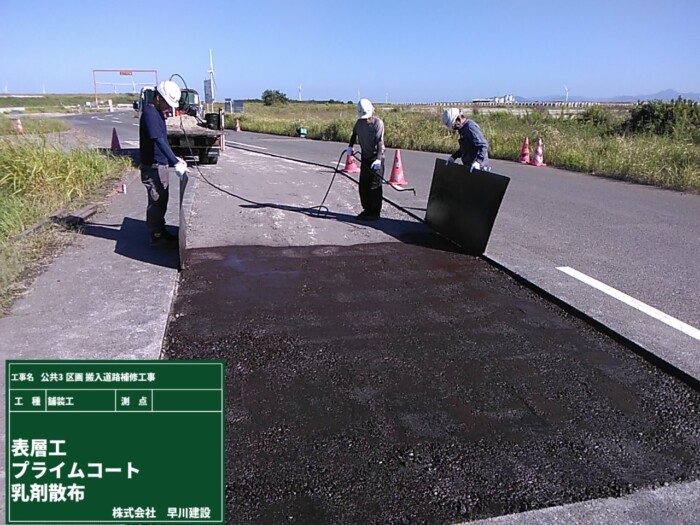 舗装工事は『測量』『路床工事』『路盤工事』『基層工事』『表層工事』の手順で進めます。 今回も手順に従い、一つ一つの工程を丁寧に進めました。